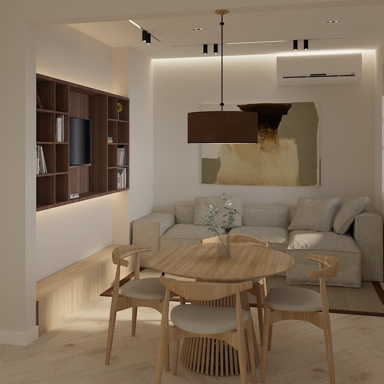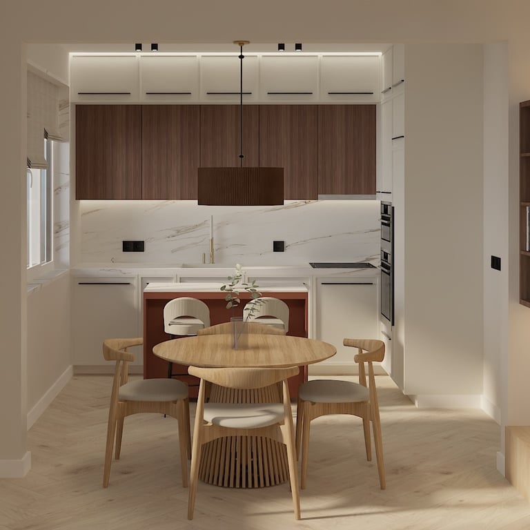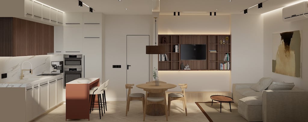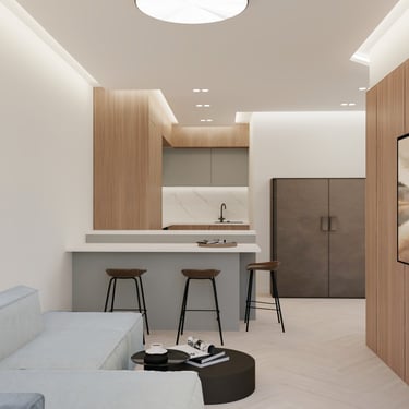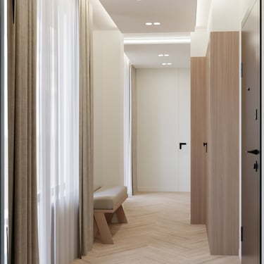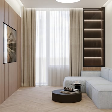 The variety of shapes and textures allowed us to create this dynamic, yet cozy and well-structured design. The calm color scheme and quality materials are the main characters of our fairy tale called "Home".
