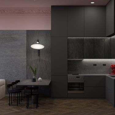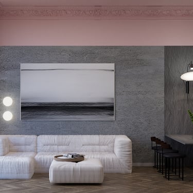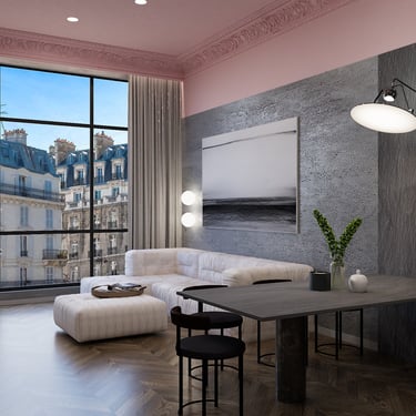A combination of the raw aesthetics of industrial design, the elegance of classic elements and the vibrancy of the pink ceiling.